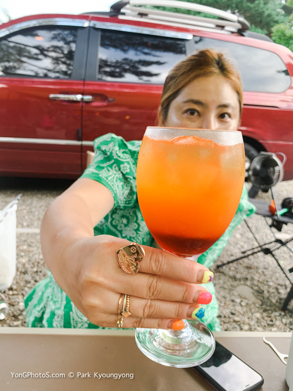 저녁으로 고기를 굽고, 간단한 음주도 곁들였다. 이번 캠핑에선 무슨 바람이 불었는지, 아내와 엉뚱이에게 예쁜 칵테일을 만들어주고 싶었다. 간단하지만 예쁜 색감을 내는 선라이즈와 셜리템플(무알콜) 만들어봤는데, 다행이 성공적이었다.