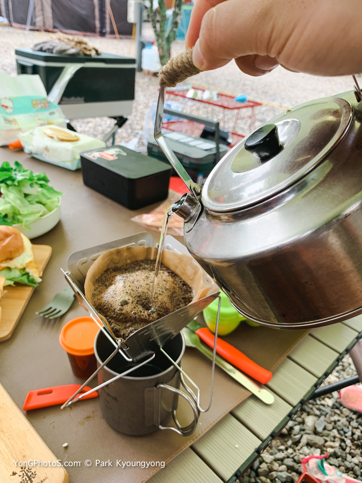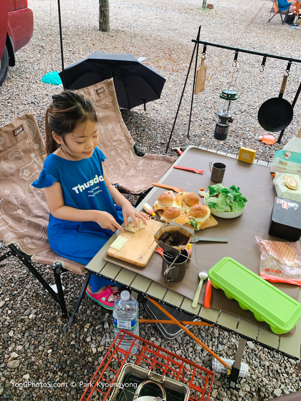 아침으로 모닝빵을 번으로 활용한 미니햄버거를 만들었다. 재료 준비를 엉뚱이가 도와줘서 비록 비가 내리고 있었지만 즐거운 마음으로 캠핑을 즐길 수 있었다. 원두도 내리고 잔잔한 좋은 음악도 깔아놓으니 호텔 조식 부럽지않은 분위기를 즐길 수 있었다. 천천히 아침을 즐기고 닝기적 거리다보니 다행스럽게도 퇴장 시간 즈음 비가 그쳤다. 쨍하고 해는 나진 않았지만 최악의 철수는 면할 수 있었다.