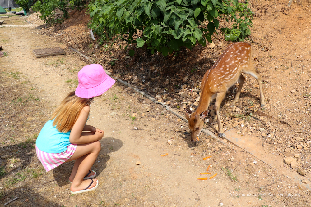소쿠리섬의 가장 큰 매력은 야생 사슴을 만날 수 있다는 점이었다. 용감한 숫사슴 한 마리는 여기저기서 먹을 것을 얻어먹고 다녔다. 심지어 우리 텐트 앞까지 와서 버섯 한 송이를 받아먹었다.