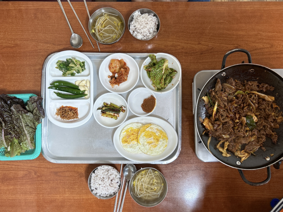 메뉴판에서 가장 먼저 눈에 띄는 돼지불백(2인분)을 주문했다. 기본 찬으로 상추와 반찬들이 세팅되고, 계란프라이도 하나씩 나왔다. 돼지불고기는 목화기사식당에 비해 색이 짙었고, 맛도 확연히 달랐다.